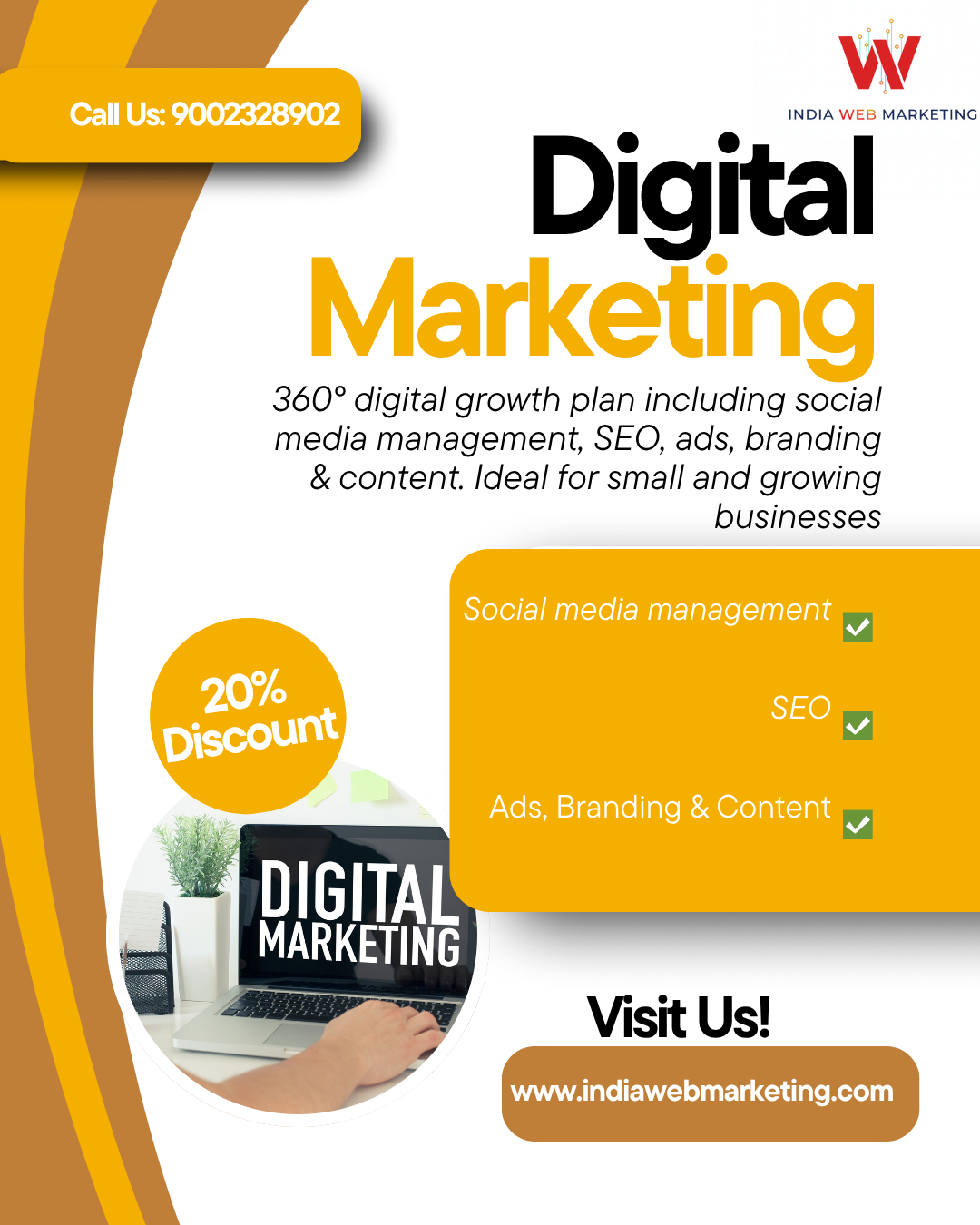 Digital marketing has become the backbone of business growth in today’s connected world, and at India Web Marketing we provide powerful and results driven digital marketing services that help your brand reach the right audience at the right time. Our approach is built on clarity, strategy, and performance. We combine search engine optimization, paid advertising, social media marketing, high quality content, email campaigns, and online reputation management to give your business a strong presence across the digital landscape.